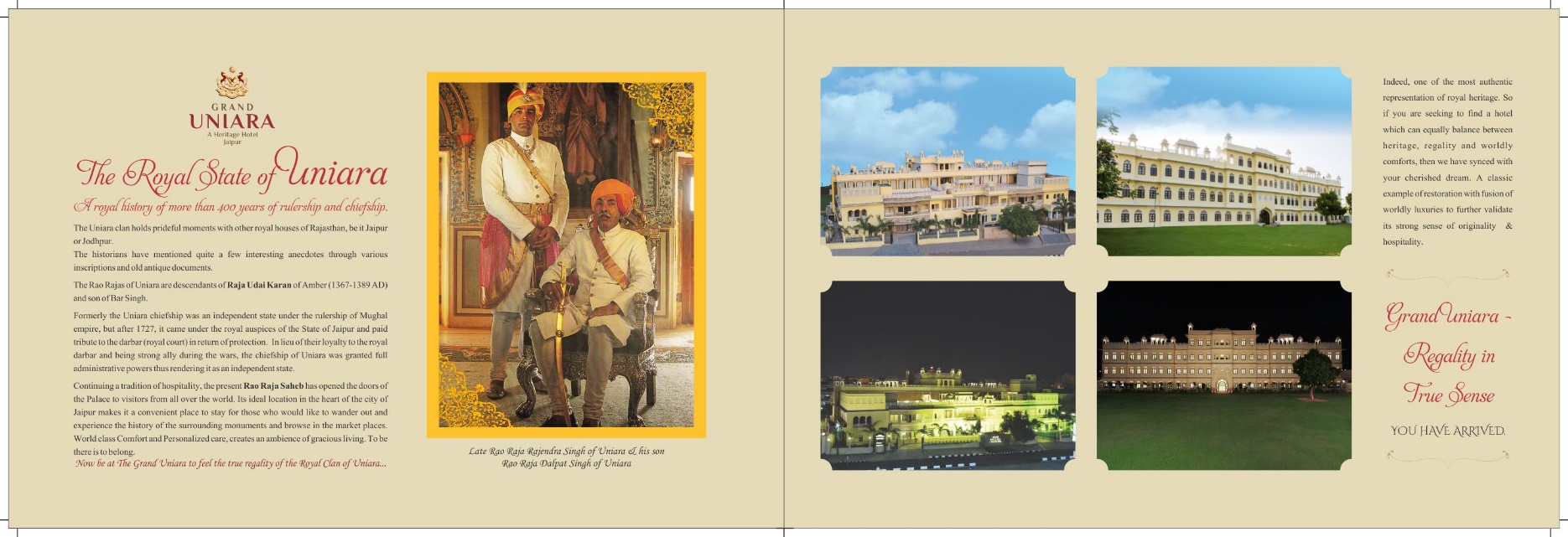 The Rao Rajas of Uniara are descendants of Raja Udai Karan of Amber and the son of Bir Singh,the Eldest son of the Maharaja Udai Karan of Amber. The Rao Raja of Uniara is descendent of Rao Das Ji, the Eldest son of Narooji. Formerly the chiefship was an independent state under the Mughal Administration. It was after 1727, it accepted administrative set up of Jaipur in the review for 1865-66 & 1866-67 and paid tribute to the Darbar in return of protection. Nevertheless, the states of Sikar, Khetri & Uniara were actually excluded from the Jurisdiction of State. All had police, army & judicial courts. Continuing a tradition of hospitality, the present Rao Raja Saheb has opened the doors of the Palace to visitors from all over the world. Its ideal location in heart of the city makes it a convenient place to stay for those who would like to wander out and experience the history of the surrounding monuments and browse in the marketplaces. World class Comfort and Personalized care, create an ambience ofgracious living. To be here is to belong.Now be at The Grand Uniara to feel the true regality of the Royal Clan Bof Uniara.